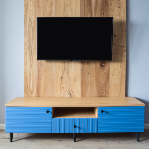 Этот шкаф предлагает гармонию стилей с белыми и синими фасадами и открытой полки из ЛДСП под дерево