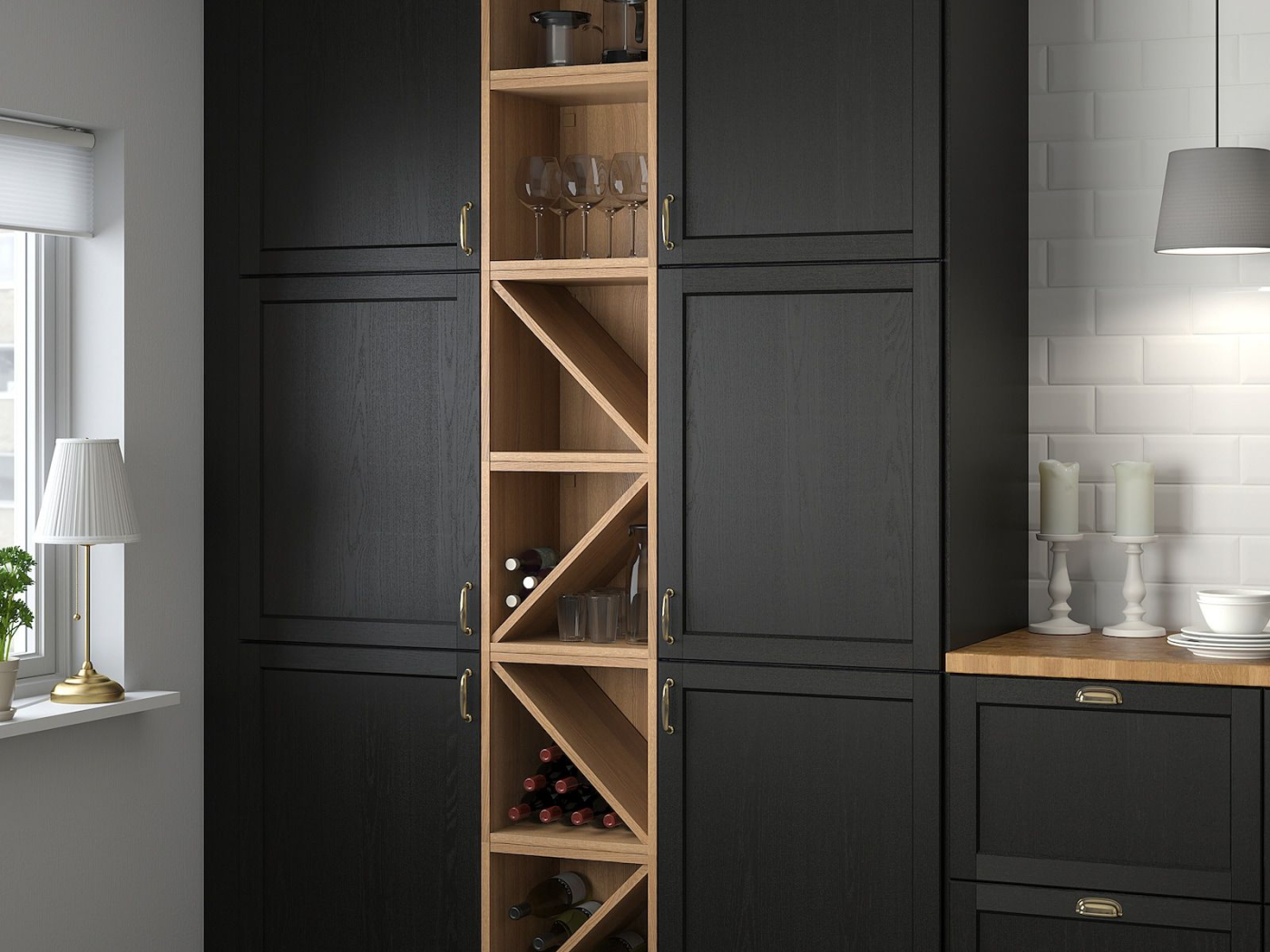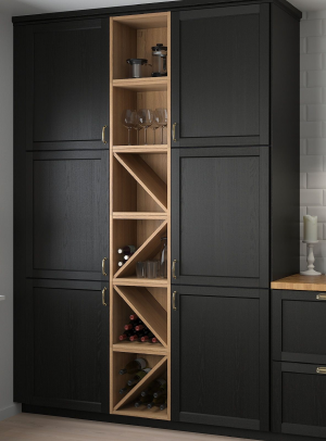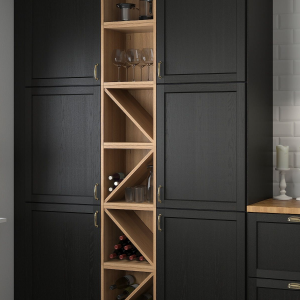 Этот шкаф создает игру света и теней, сочетая светлый цвет с ручками в стильном исполнении и открытыми полками под дерево.