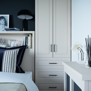 С этим серым шкафом, украшенным деревянной вставкой, Ваша спальня станет образцом совершенства
