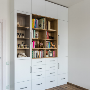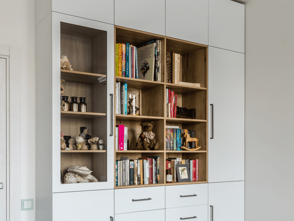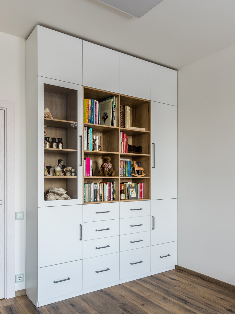 Шкаф сочетает удобство открытия дверей по нажатию и практичные полки для хранения детских сокровищ